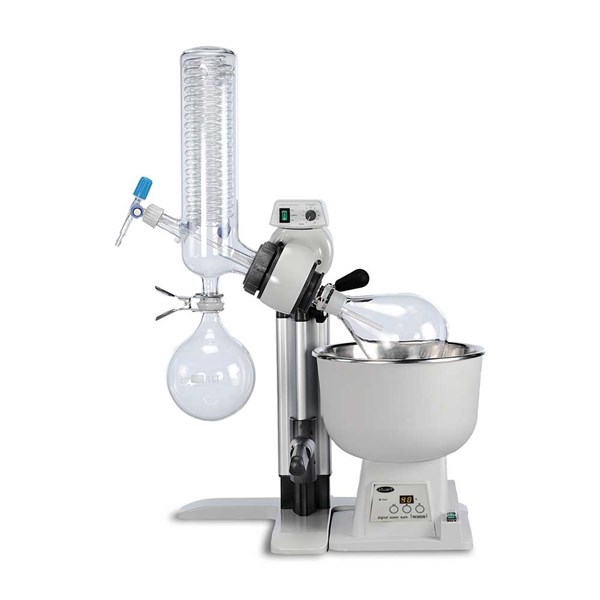 Vertical Condensor Rotary evaporator complete with glass set 01P (Vertical coil condenser plastic coated, vapour tube for vertical condenser, receiving flask 1000ml plastic coated, Florentine flask 1000ml plastic coated, feed tube with stopcock, vacuum seal, conical joint clip, spherical joint clip.)