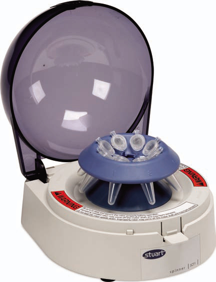 The SCF1 is a mini personal spinner for centrifugation of up to 8 x 1.5ml or 2.2ml microfuge tubes or two strips of 8 x 0.2ml tubes at speeds of up to 6,200rpm. The rotors (supplied) are easily installed without the use of tools. The SCF1 is very simple to use with the added advantages of a small footprint and quiet operation. The unit operates as soon as the lid is closed and automatically stops when it is opened. Alternatively it can be operated via a mains on / off switch.