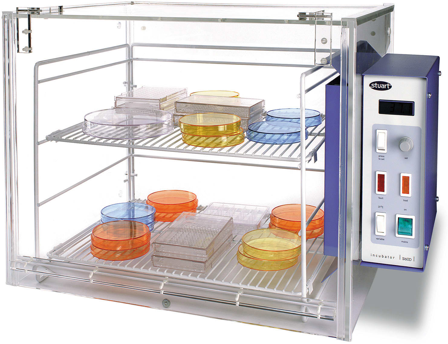 Constructed from clear Acrylic polymer to give total visibility of samples at all times. Designed for easy access with hinged front door panel. Each side panel has 2 x 10mm diameter plugged holes for the introduction of either gases or cables. The incubator does not have a base so that it can be placed directly over complete instruments (base is available as an accessory). Forced air circulation and electronic temperature control ensure accurately maintained conditions. For analogue model SI60, setting the temperature is via a calibrated knob. For digital model SI60D, setting the temperature is more accurately achieved via the LCD display. The latter also gives a constant reading of actual temperature. Both models have a push switch pre-set at 37°C. Additionally there is a temperature safety cut-out set at 72°C. The incubator is supplied flat packed, for assembly at point of use. Assembly is simple and requires only a screwdriver.