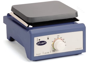 Stylish and economical general purpose hotplate designed with safety as well as performance in mind. The compact shape takes up less bench space and makes storage easier. The hotplate has microprocessor control and an innovative LED based true °C temperature setting system rather than simply a 1 to 10 arbitrary scale. The unit can also be used in conjunction with the SCT1 digital contact thermometer to accurately control sample temperature rather than plate temperature. The “Hot” warning light will flash whenever the plate temperature is above 50°C even when the hotplate is turned off and unplugged from the mains. Model UC150 has a glass ceramic top which has excellent chemical resistance. The surface is easy to clean and allows high plate temperatures for faster heating. Model US150 has a robust aluminium/silicon alloy top plate for excellent heat transmission. The top plate has a thin ceramic coating for added chemical resistance. A 700W element gives rapid heating and ensures even temperature distribution across the whole surface of the plate. Both models have an integral fitting for a retort rod and the bottom is shaped to allow a retort base to slide underneath the unit if required to make experiment setup quicker.