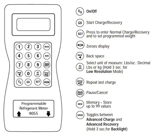 The 9055 Programmable Refrigerant Meter allows you to quickly, efficiently and automatically charge refrigerant into, or recover refrigerant from, any air conditioning or refrigeration system. It is the most accurate and cost effective method of dispensing refrigerant. The Advanced Charge and Recovery Modes calculate the maximum Charge/Recovery available for you by taking into consideration the cylinder tare weight and the maximum weight capacity of the tank. Self-powered by four "AA" and one 9V battery; the 9055 is completely portable and with a weight capacity of up to 220 lbs. or 100 kg, it is capable of handling a wide range of cylinders, including recovery/recharge tanks. The unit includes both 1/4" external Flare fittings and 1/2" ACME fittings to allow connection to all standard charging manifolds and all types of refrigerant cylinders. The 500 PSI rating of the solenoid valve is compatible with, and capable of handling, all common refrigerants. The keypad is color-coded and along with audible tones, permits simple operation. Whenever an acceptable or affirmative key is pressed, a positive, high frequency beep is heard. Unacceptable or incorrect key presses are accompanied by a lower frequency sound, alerting the user that an entry was made in error.