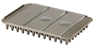 The in situ adapter is a single piece of machined aluminium and apart from regular cleaning with water and a mild laboratory cleaning detergent, is completely maintenance free. The design allows easy removal of glass slides via the corner cut-outs. The aluminium perimeter ridge is a further design feature which allows the thermal cycler lid to be closed without risking damage to glass slides and PCR sample