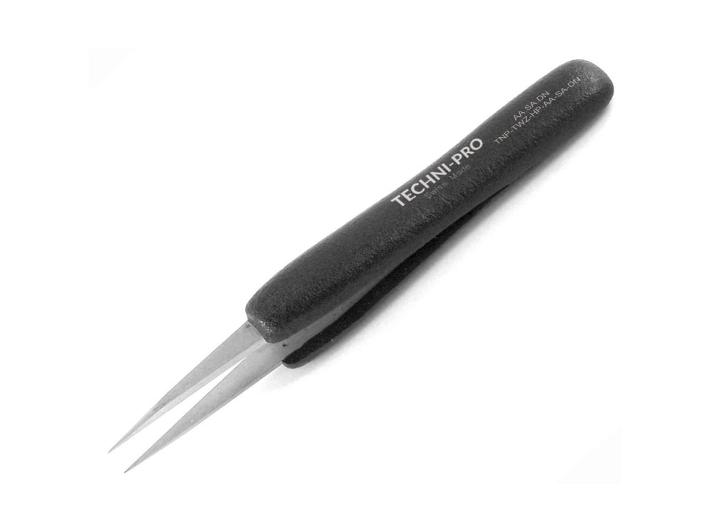 The Techni-Pro TNP-TWZ-HP-AA-SA-DN is a tweezer, ESD foam style AA, anti-acid/anti-mag SS, fine sharp, 5.1". It is an AA Type of Boley Tweezer that is suitable for applications that require a firm hold on a component. The ESD foam grip provides tweezers with ESD properties combined with an ergonomic handle suitable for electronic component handling and clean room use.