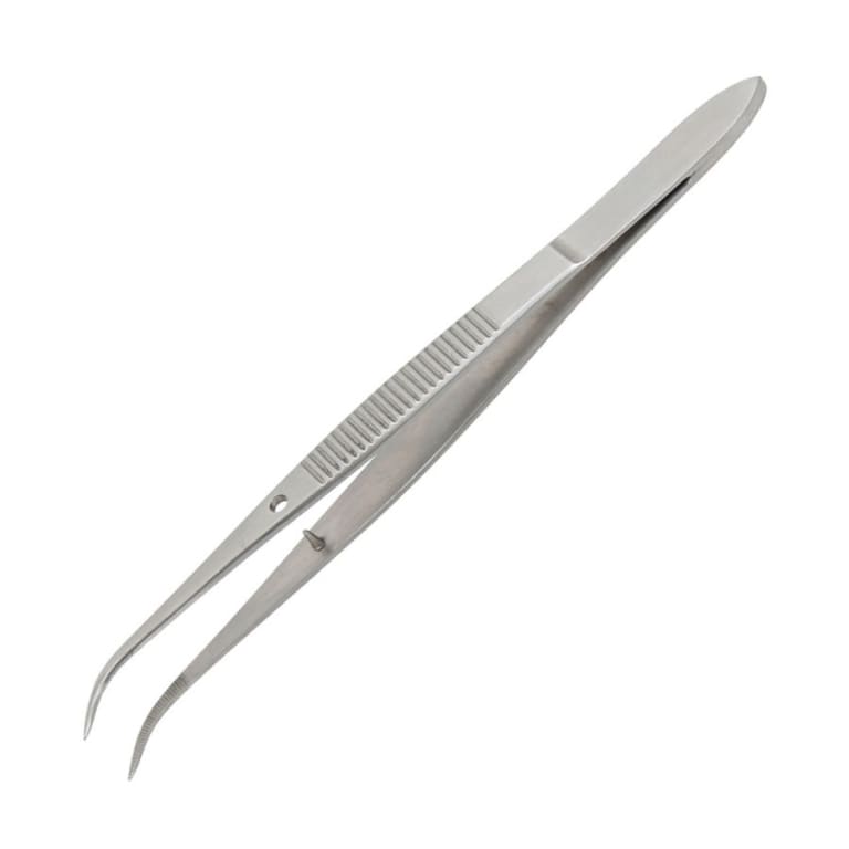 The Techni-Pro TST-24A-S Economy Tweezers have curved tips at 45 degrees and strong serrated tips. The body is made of magnetic stainless steel. The overall length is 4.5".
