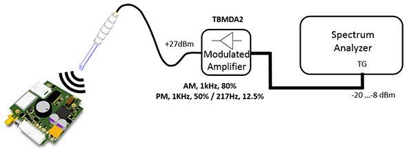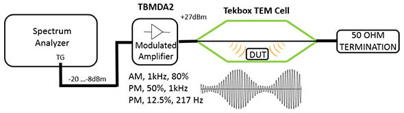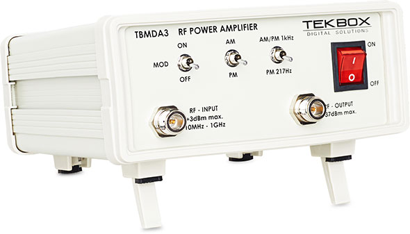 The TBMDA3 modulated wideband power amplifier is designed in order to create an inexpensive signal source for immunity testing of electronic building blocks and products. It is designed to be driven by the tracking generator output of spectrum analyzers. With an input power range of -5dBm…0dBm, it can boost the output power of a tracking generator up to 5W. The TBMDA3 is ideal to drive Tekbox near field probes in order to find the sensitive spot of an electronic circuit or to create electric fields up to 550V/m when driving the Tekbox TEM Cell TBTC0, 300V/m when driving the TBTC1, 150V/m when driving the TBTC2 or 100V/m when driving the TBTC3. Test signals for immunity testing can be CW, AM or PM modulated. Consequently, the TBMDA3 provides built in modulation capability to generate 1 kHz AM or PM signals. In PM mode, the TBMDA3 can also generate a 217 Hz Signal with 12.5% duty cycle in order to simulate mobile phone TDMA noise.