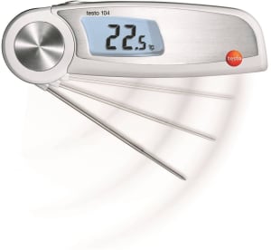 The testo 104 is the first ever waterproof folding thermometer! Its protection class IP65 allows the instrument to be cleaned under running water, and used under any conditions. The instrument has a robust metal joint with a rigid temperature probe. The surface is covered with non-slip rubber, guaranteeing comfortable, safe handling and measurement. With the help of colored strips, the instrument can also be easily allocated and personalized. The testo 104 folding thermometer is conformant to HACCP and EN 13485. Its narrow measurement tip leaves only small punctures in the food, making it ideal for spot check measurements, for production, storage and processing, supermarkets and more.