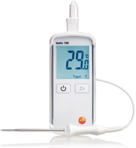 The testo 108 waterproof food thermometer is a reliable and rugged solution for food measurement needs. With a sleek, compact, waterproof housing and interchangeable Type T and Type K probes, the testo 108 offers a wide variety of measurement options for most food applications. he testo 108 can perform temperature spot checks in a matter of seconds whether for transport and storage of food, in restaurants, in large scale kitchens or the food service industry. If you want to measure temperature, this instrument is all you will ever need. It will enable you to integrate temperature measurement effortlessly into your day-to-day work. Trust the testo 108 to meet your HACCP compliance requirements. Its protective cover is impervious to moisture and water, and protects the meter and the probe from damage due to impact or dirt. Wherever temperature needs to be recorded, the 108 delivers the ruggedness, reliability and accuracy you expect. Monitor Food Temperature: During Storage In the food sector, the cooling chain has to be checked and verified. Part of this is the temperature check during storage. The temperature of food has a decisive effect on the generation and reproduction of germs/bacteria on the food. It is therefore necessary to monitor the temperature continuously to ensure food safety. For storage, both mobile sampling and stationary temperature measuring instruments should be used. Monitor food storage temperature to ensure that the temperature of goods complies with regulations and that the goods can be "safely" accepted and used for consumption.