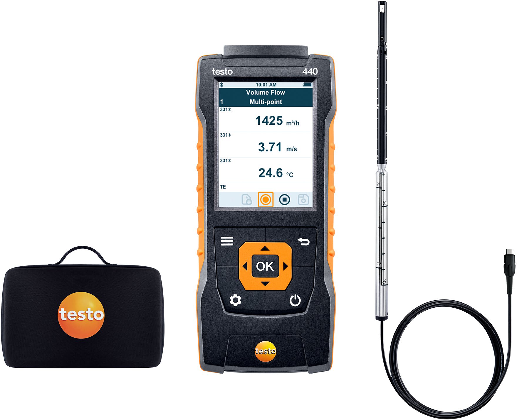 These packages all contain the Testo 440 or 440dP, but are offered with a variety of different probes and accessories. The following is an overview of each system: •440 100mm Vane BT •Part number 0563 4403 •testo 440 100 mm Vane Kit with Bluetooth •Includes 100 mm vane probe with Bluetooth, incl. temperature sensor •440 16mm Vane •Part number 0563 4401 •testo 440 16 mm Vane Kit •Includes Vane probe, fixed cable (1.8 m) with telescope (0.85 m) •440 Airflow Kit 1 BT •Part number 0563 4406 •testo 440 Air Flow ComboKit 1 with Bluetooth •Includes 100 mm vane probe with Bluetooth, incl. temperature sensor •Includes Hot wire probe with telescope (0.85 m) incl. temperature sensor, fixed cable (1.8 m) •440 Airflow Kit 2 BT •Part number 0563 4407 •testo 440 Air Flow ComboKit 2 with Bluetooth •100 mm vane probe with Bluetooth, incl. temperature sensor •16 mm vane probe with telescope (0.85 m), fixed cable (1.8 m) •440 CO2 BT •Part number 0563 4405 •testo 440 CO2 Kit with Bluetooth •Includes CO2 probe with Bluetooth, incl. temperature and humidity sensor •440 Delta P Kit 1 BT •Part number 0563 4409 •testo 440 delta P Air Flow ComboKit 1 with Bluetooth •Includes the following: •Universal probe handle with Bluetooth •Hot wire probe head incl. temperature and humidity sensor •100 mm vane probe head incl. temperature sensor •Telescope (1 m) and 90° angle to fit both probes •440 Delta P Kit 2 BT •Part number 0563 4410 •testo 440 delta P Air Flow ComboKit 2 with Bluetooth •Includes the following: •Universal probe handle with Bluetooth •16 mm vane probe head •100 mm vane probe head incl. temperature sensor •Humidity probe head incl. temperature sensor •Telescope (1 m) and 90° angle for both probes •440 Hot Wire •Part number 0563 4400 •testo 440 Hot Wire Kit •Includes Hot wire probe incl. temperature sensor, fixed cable (1.8 m) with telescope (0.85 m) •440 Humidity BT •Part number 0563 4404 •testo 440 Humidity Kit with Bluetooth •Includes humidity and temperature probe with Bluetooth •440 Indoor BT •Part number 0563 4408 •testo 440 Indoor Comfort ComboKit with Bluetooth •Includes the following: •Turbulence probe (400mm) •CO2 probe with Bluetooth, incl. temperature and humidity sensor