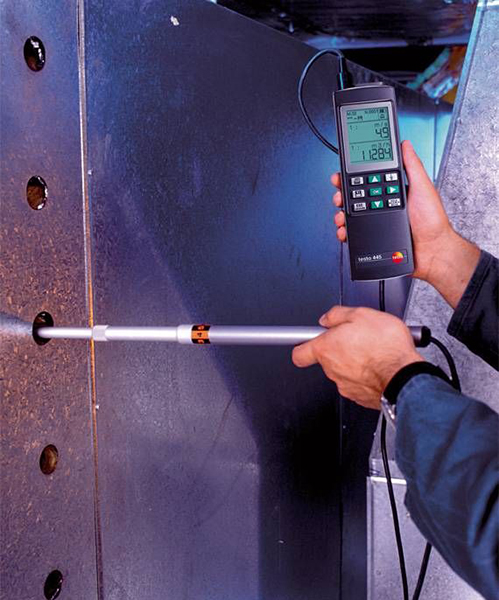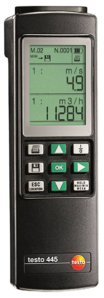 The testo 445 has two probe inputs for the connection of a broad range of probes for measurements on ventilation/air conditioning systems. The instrument records flow velocity values in a duct, at a duct outlet or on extraction systems. In addition to this, the allrounder measures or calculates the parameters volume flow, Indoor Air Quality, temperature, relative humidity, dewpoint, absolute humidity, degree of humidity, enthalpy, pressure and CO. At the simple press of a button, the testo 445 displays the last measurement value measured as well as minimum, maximum and mean values. In addition to this, measurement data can be stored according to measurement site and analyzed on a PC, or documented on site with the Testo fast printer. Please note, the Testo 445 requires a sensor to be connected for start up. Probes are sold separately - please click here for a complete list.