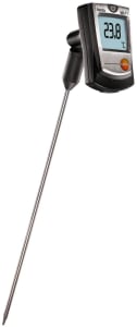 The testo 905-T1 penetration thermometer has a large measuring range from -58 to +662 °F, and can even measure up to +932 °F for a short time (1 to 2 minutes). Its permanently integrated type K thermocouple probe makes this possible. In addition, this penetration thermometer is characterized by its short response time. The thermocouple probe reacts very quickly, particularly in water (or other liquids). This penetration thermometer is therefore ideally suited for measurements in fluid substances in laboratory, chemical, and pharmaceutical areas.