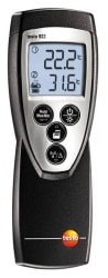 The testo 922 is a temperature measuring instrument which is especially suited to applications in the HVAC field. The measuring instrument records the temperature values of two connected thermocouple probes, and shows these simultaneously together with the differential temperature in the display. Measurement data transfer by radio additionally allows the measurement value from a further temperature probe to be displayed wirelessly. With the TopSafe, and the probe plugged in, the measuring instrument has protection class IP65. The instrument continuously displays the minimum and maximum values. The measurement values shown in the display (current measurement value, fixed measurement value or the minimum/maximum value) can be printed out on site using the Testo report printer (optional). In addiition to this, the measurement values can be cyclically printed - the intervals can be individually set. Features include: