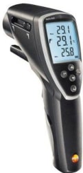 The testo 845 is a compact infrared thermometer with switch optics for the non-contact measurement of surface temperatures. The switchable optics for far-field and close focus measurements make it possible to measure at short as well as at greater distances. Measurements in the far- field are taken at an optical resolution of 75:1. This allows surface temperatures to be measured accurately even at greater distances to the measurement object. At a distance of 1.2 meters to the measurement object, the measurement point diameter is only 16 mm. A cross laser marks the measurement site exactly. For measurements at a short distance to the measurement object, the close focus optics offer a measurement point diameter of only 1 mm at a distance of 70 mm. Two laser points mark the measurement area. Measurements can also be carried out by connecting additional probes. The limit values can be individually stored in the instrument; as soon as these upper and lower limit values are violated, an audible and an optical signal are given.