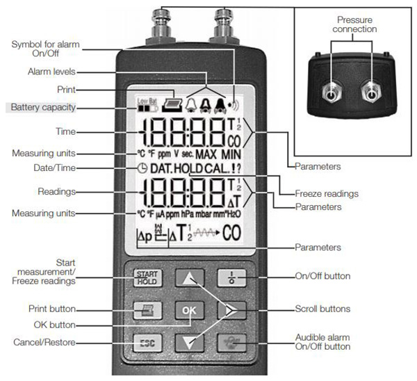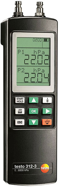 The versatile testo 312-3 pressure measuring instrument supports load and gas-rightness tests on gas and water pipelines up to 6000 hPa (6 bar) quickly and reliably. Via the adjustable alarm, the instrument immediately issues a warning when limit values are exceeded, and the measurement results can be documented directly using the optional Testo printer.