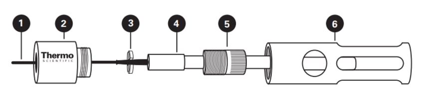Assembly of the Protective Guard Insert the probe cable (1) into the slot in the clamping ring (3) with the recessed side placed on the top of the probe cap (4). Insert the probe connector into the threaded side of the retainer (2) and pull the cable through the hole until the clamping ring is seated flush in the retainer. Slide the probe retainer nut (5) over the probe body and screw it into the retainer threads until hand tight. Do not overtighten the probe retainer nut. Screw the probe body sleeve (6) onto the retainer threads until hand tight. Disassembly of the Protective Guard Remove the probe body sleeve (6) by unscrewing it. Remove the probe retainer nut (5) from the retainer (2) by unscrewing it. Slide the probe out of the retainer so that the clamping ring (3) can be removed without obstruction. Continue pulling the probe cable (1) through the retainer, taking care not to lose the clamping ring. Slide the clamping ring away from probe cap (4) and off of the strain relief so that it can easily be removed from the probe cable. To prevent loss of components, reassemble the protective sleeve before storing the assembly. Note: Do not place excessive force on the probe cable when disassembling as this may damage the cable.