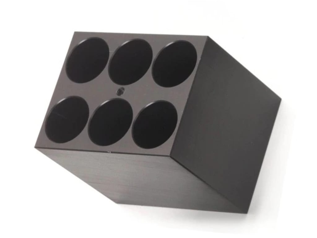 Tall aluminum alloy mounting block for holding up to six 50ml tubes for drybath heating or cooling.