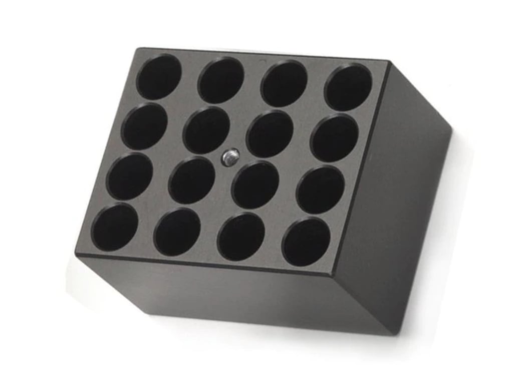 Aluminum alloy mounting block for holding up to sixteen 16mm diameter tubes for drybath heating or cooling.