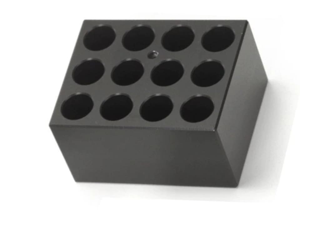 Aluminum alloy mounting block for holding up to twelve 18mm diameter tubes for drybath heating or cooling.