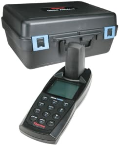 Measure common colorimetric water and wastewater parameters using the Thermo Scientific AQ4000 Orion AQUAfast Colorimeter with 65 preprogrammed methods, automatic selection of four wavelengths and timer. Use Auto-Test ampoules with Auto-ID barcodes to simplify sample preparation and tests - ampoules contain pre-measured liquid reagent and fill with the exact volume of sample, colorimeter reads the barcode and automatically identifies the parameter and initiates the test. This IP67 waterproof meter records 100 data points and offers an average battery life of 2500 hours of intermittent use.