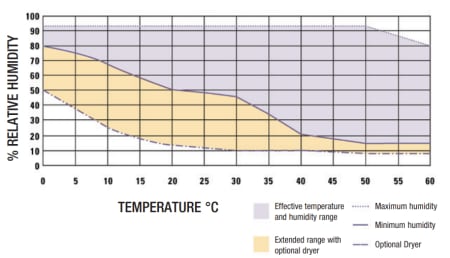 The following chart illustrates the maximum and minimum attainable humidity within the cabinet at a given set temperature under the following nominal conditions: refrigeration on, defrost off, no wet bulb recorder, no air exchange, set for 22.2°C (72°F) and 50% RH ambient. Optional heatless dryer is available for lower humidity levels.