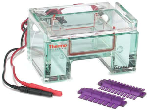 Cast and run a gel in the buffer chamber and achieve flat, even banding patterns on a consistent basis with Thermo Scientific Owl EasyCast B1A Mini Gel Electrophoresis Systems. The ideal size for every lab, this system determines molecular weight ranges of PCR fragments or larger sized DNA molecules.