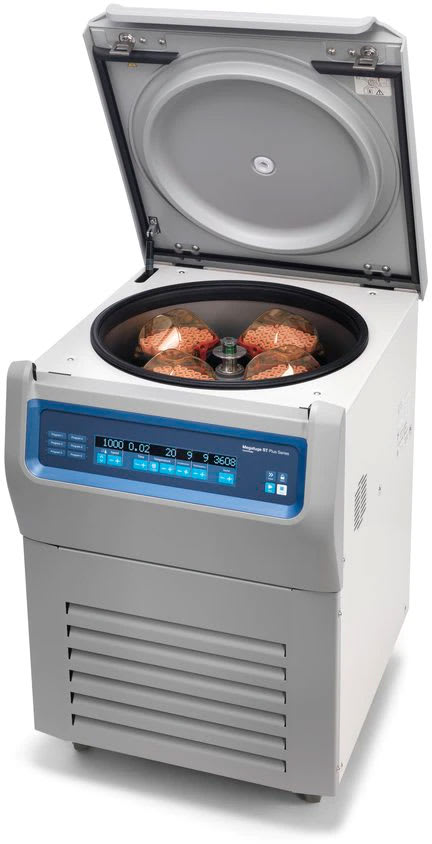 The Thermo Scientific Megafuge ST4F R Plus-MD Centrifuge (120V) features an ergonomic design, a standard high contrast user interface for up to 6 saved programs with a simple push-button operation for routine applications. With capacity up to 4L, including 196x5/7 ml blood tubes and 40x50 ml conical tubes, AutoLock for fast rotor exchange. This floor-standing unit saves bench space. Thermo Scientific SMARTSpin Technology: