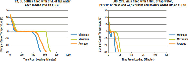 These examples show how much time you can save by using the XBF40D to bring any critical sample, or volume, to storage temperatures. As shown below, a test of 5L bottles filled with 3.5L of tap water reached 0°C on average of 100 minutes and -30°C on average of 600 minutes. A grouping of 2mL vials reached 0°C in 5 minutes and -30°C in 25 minutes.