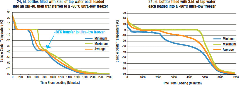 In a test comparing freezing times between the XBF40D and a -80°C ultra-low freezer, a group of 5L bottles on average reached -70°C in the XBF40D 75% faster than an ultra-low freezer.