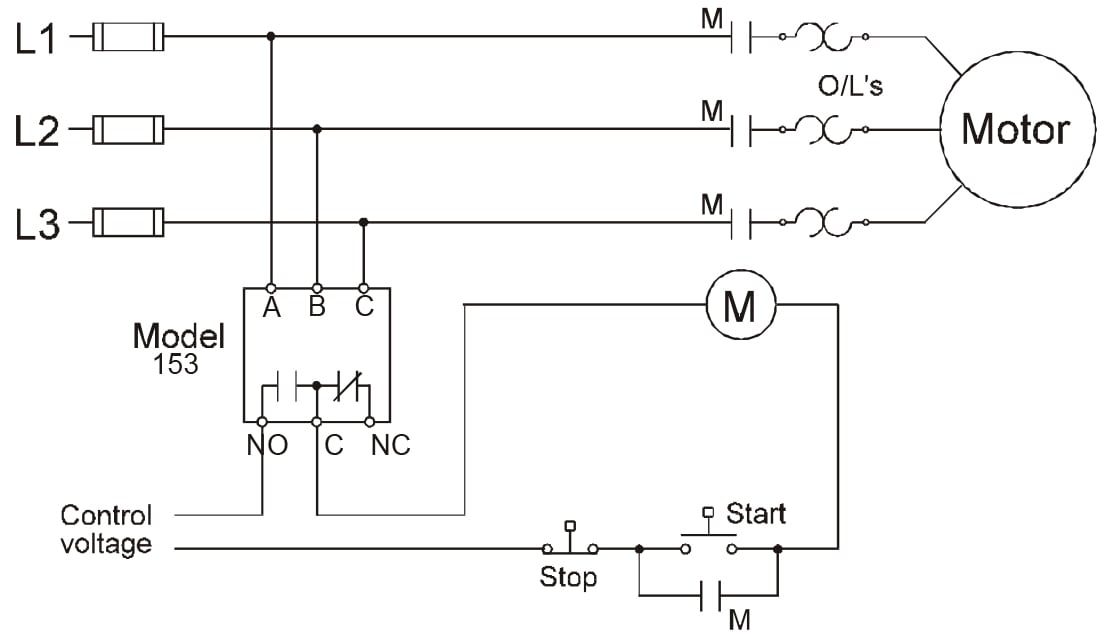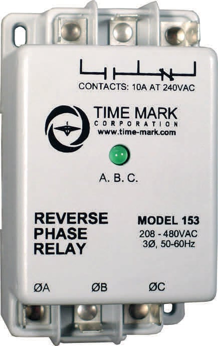 The Time Mark 153 Reverse Phase Relay is designed to continuously monitor the phase rotation of 3-phase lines. This device should be used in applications where proper phase rotation is critical, such as fan motors, compressors, grinders, elevators, etc. The solid-state sensing circuit drives an internal electromechanical relay which energizes when power, with correct phase rotation, is applied. The relay will not energize if the applied phases are reversed. It will de-energize if phase rotation is reversed while the motor is running. An LED indicator will illuminate with the correct ABC phase rotation.