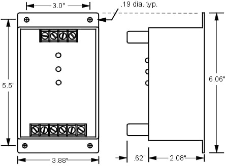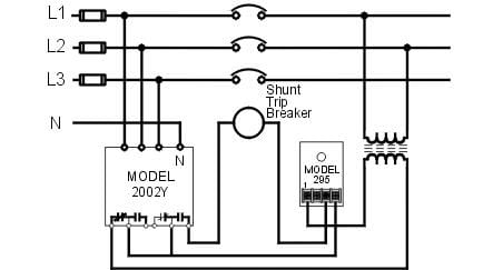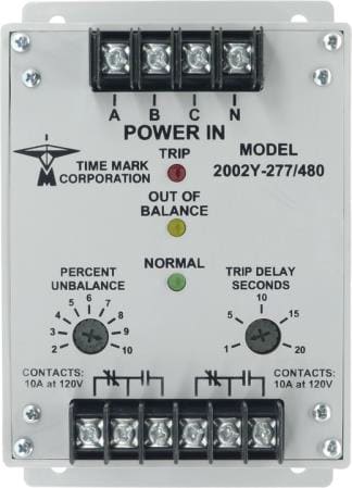 The Time Mark 2002Y-277/480 3-Phase Voltage Unbalance Monitor is designed to continuously monitor a three-phase line with a neutral connection for unbalanced voltage conditions. The unit offers 277 VAC phase-neutral voltage, 480 VAC phase-phase voltage, ± 15% voltage range, and 2.0W power consumption. This device will only energize the relay if an unbalance exists. Zero volts on all three phases is considered a balanced condition. This allows the Model 2002Y to be used with shunt breakers so that the main power can be restored without resetting breakers. The solid-state sensing circuit drives an internal electromechanical relay. Indicator lights on the monitor show when the voltage balance is within an acceptable range, when an unbalance exists, and when the relay is actually tripped.