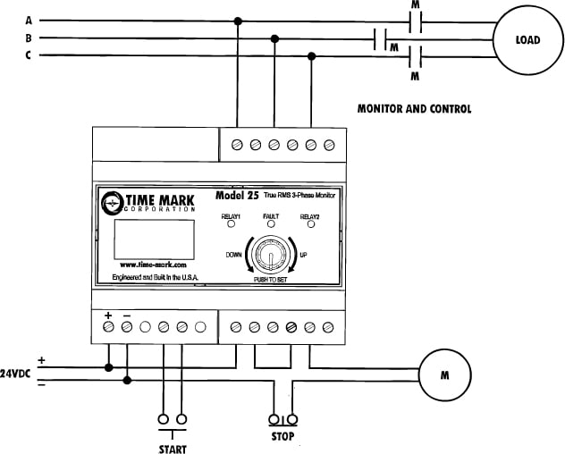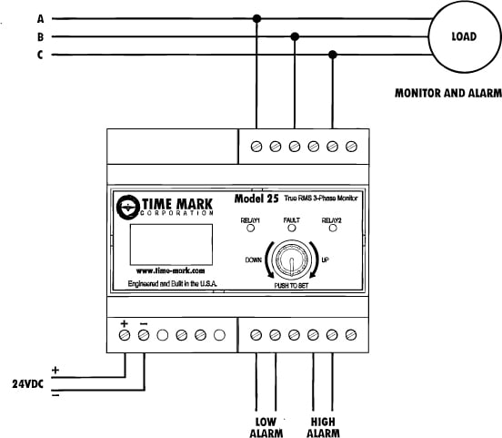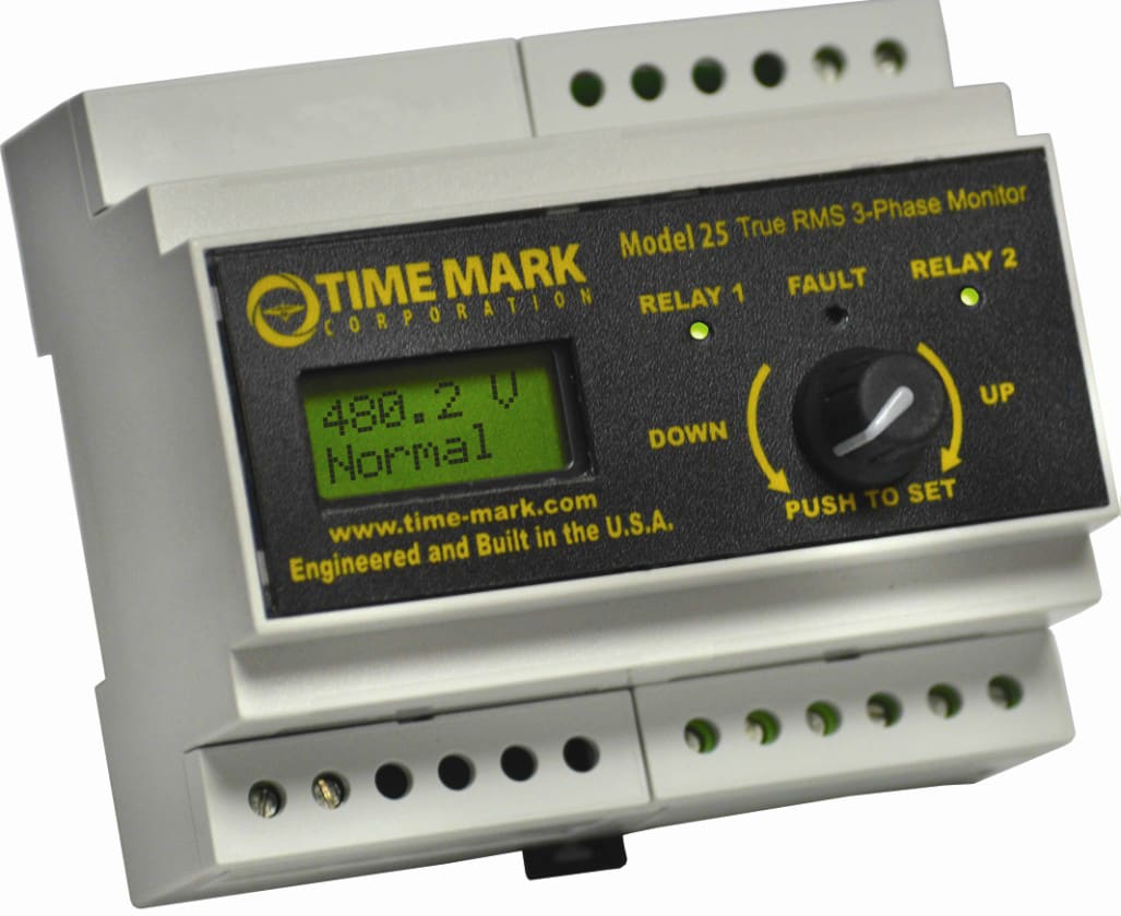 The Time Mark 25 True RMS 3-Phase Monitor has a display that shows the voltage with an accuracy of +/- 0.5%. The display is updated every second and re-initialized every 30 seconds. Model 25 has a rotary encoder with a switch on the unit. By pressing the encoder switch for more than 5 seconds, the unit will enter the setup mode. This unit has a user-selectable relay option for High-Low or DPDT. It can also be user-selected to energize on fault or de-energize on fault. The user can select automatic or manual restart on the Model 25. The Model 25 True RMS 3-Phase Monitor can be either calibrated using a True RMS Voltmeter or can be restored to factory defaults in the field.