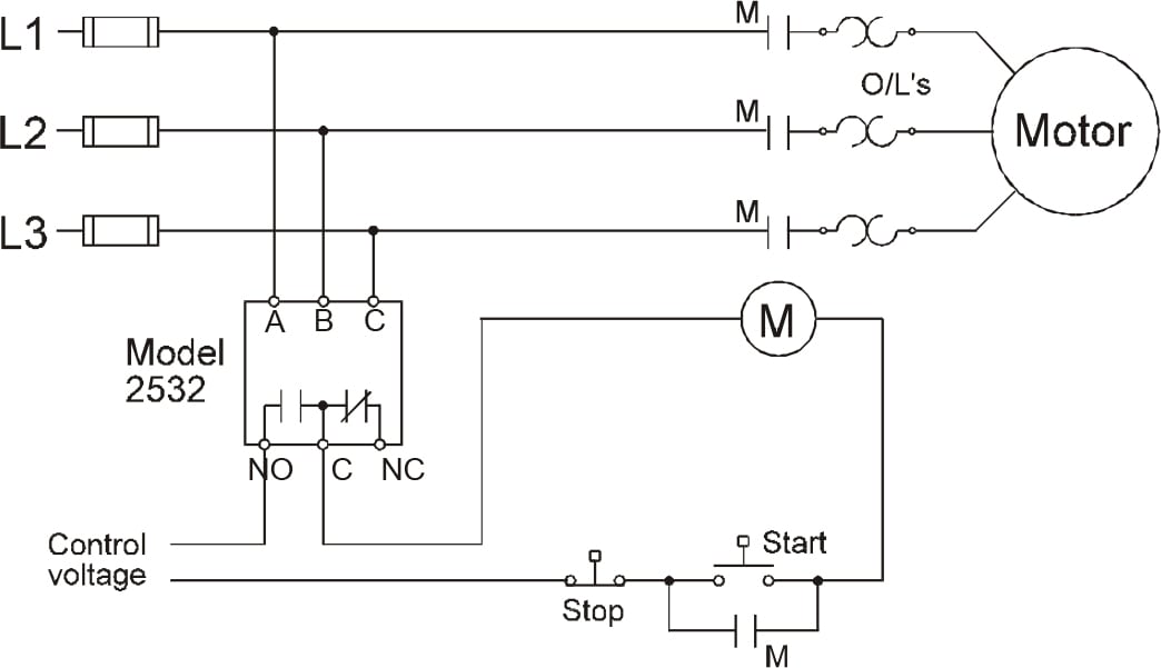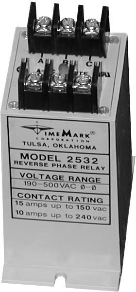 The Time Mark 2532 Reverse Phase Relay is designed to continuously monitor the phase rotation of 3-phase lines. This device should be used in applications where proper phase rotation is critical, such as fan motors, compressors, grinders, elevators, etc. The solid-state sensing circuit drives an internal electromechanical relay which energizes when power, with correct phase rotation, is applied. The relay will not energize if the applied phases are reversed. It will de-energize if phase rotation is reversed while the motor is running. An LED indicator will illuminate with the correct ABC phase rotation.