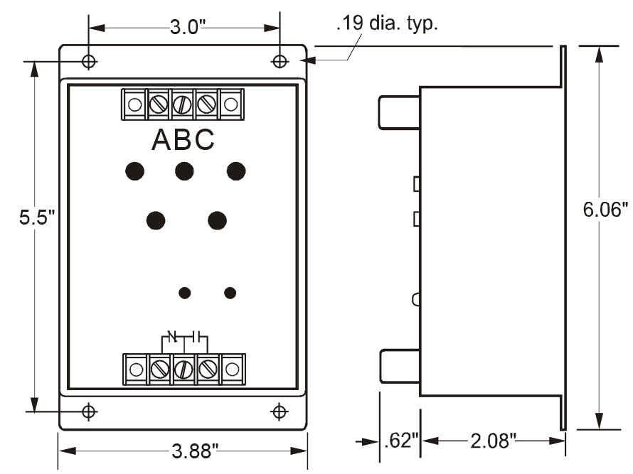 The Time Mark C2638 is a 3-phase monitor with line voltage and phase sequence indicator. The unit offers up to 480 VAC of nominal voltage, 60Hz frequency, 380-480V adjustment range, and 6.7 W power consumption. Like other Time Mark monitors, the Model 2638 series senses phase loss, phase reversal, and low voltage. When power and phasing are correct, the internal relay energizes. LED indicators will show that all phases are present and the direction of phase rotation. When a fault occurs, the monitor trips its relay and indicates which phase is lost or if a reversal is present. This allows you to automatically protect your equipment by correcting the appropriate fault condition. The Model 2638 series will automatically reset when the correct power is restored.