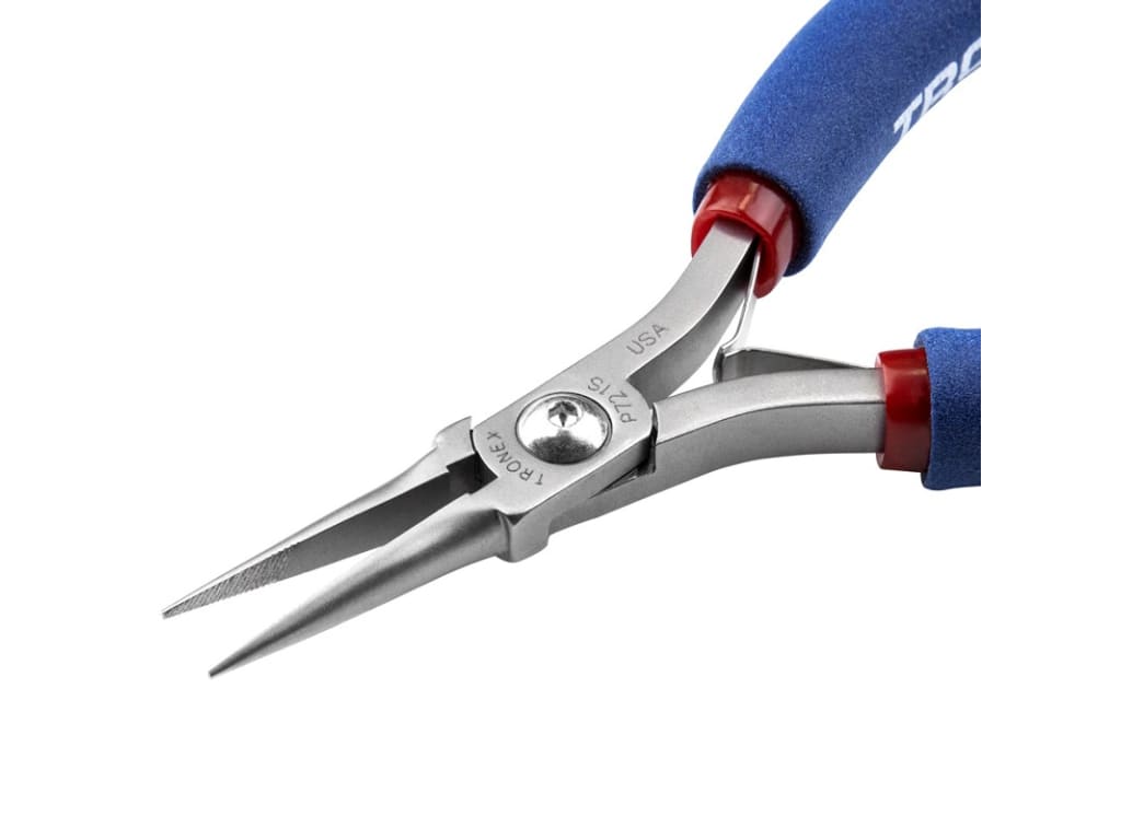 The Tronex P721S is a needle-nose plier with long-jaw serrated tips. This needle-nose plier is used primarily in fine electronics work. It has jaws that are machined into thin half-cones. This thin profile increases tool access. The cone shape can be used for precision loop forming of leads or wire.
