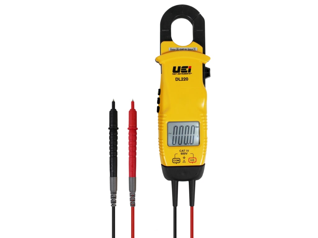 The DL220 has a good feel with its ergonomic design and thumb leveler that slides the clamp jaw open and close. It features connected test leads, built-in test lead storage, and a bright backlit display.