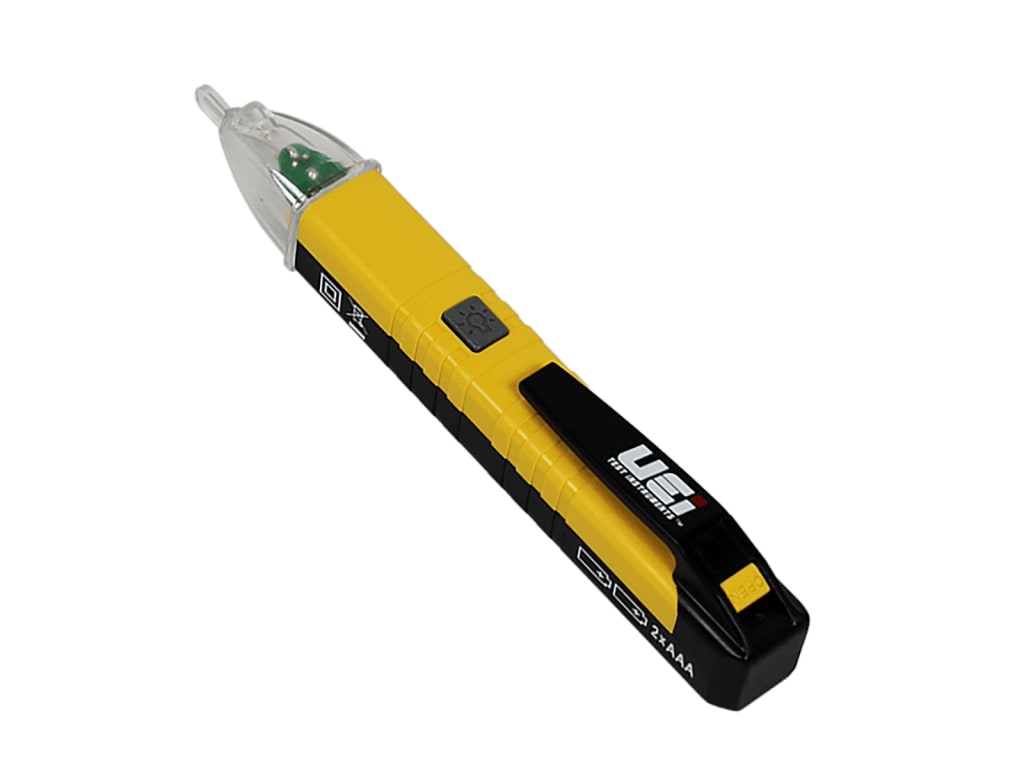 The UEi NCV3 Non-Contact Voltage Tester senses low voltage (24 to 48 V AC) and high voltage (48 to 1000 V AC). The bright green LED indicates the tester is operational, while the red LED visual and audio alerts indicate live voltage. The UEi NCV3 includes a clear LED work light magnetic mount and is powered by 2 AA batteries with low battery indication. The NCV3 is ETL listed, rated CAT IV 1000 V, and is backed by a one-year limited warranty.