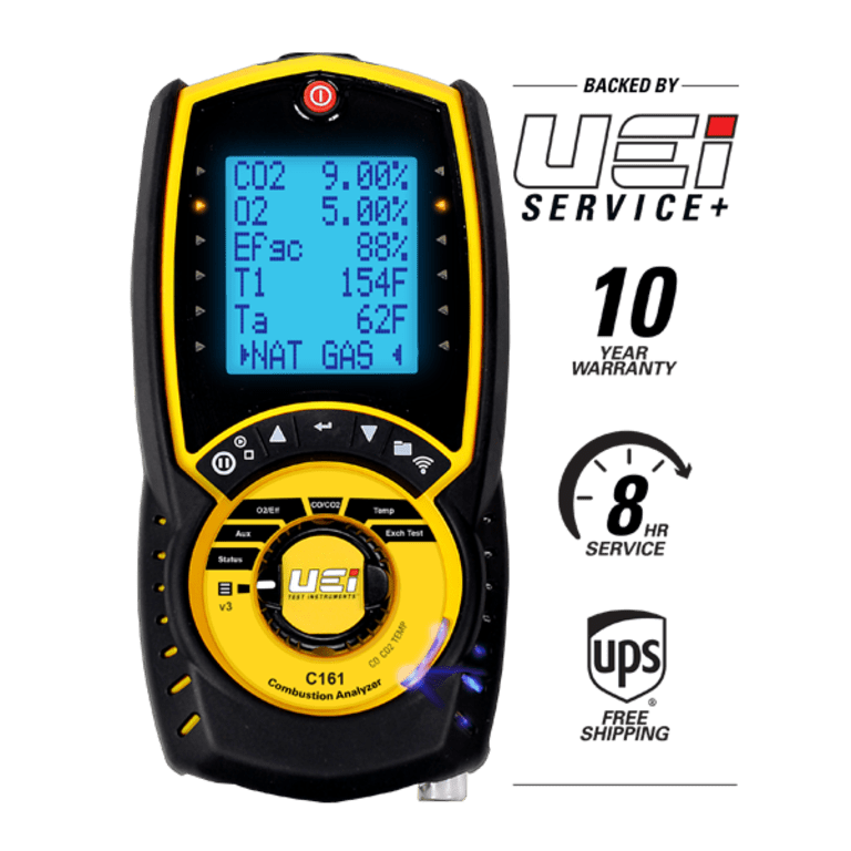 The UEi C161C has two levels of sensor protection; a NOx filtered CO sensor and Low Flow Detection. It also has UEi’s EOS sensor technology that reduces the cost of ownership, and a Heat Exchanger test to check the exchanger integrity, and differential temperature. The C161C comes with high altitude compensation to maintain accurate readings at any altitude, auto-purge shut-off, and Pre-programmed fuels including Natural Gas and Propane.