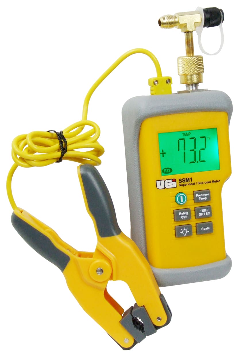 The Uei SSM1 is used to measure superheat and subcooling by direct connections for temperature and pressure. The SSM1 is programmed with the most common four refrigerants, with data from the NIST-Pro refrigeration database for temperature-pressure values.