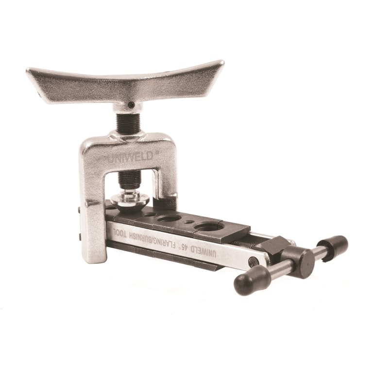 Uniweld’s 70003 Heavy Duty Flaring Tool has a hardened steel flaring cone with a chrome finish for more uniform flaring without galling. Specially shaped wing nuts allow the long handle of the self-centering yoke to be used as a lever when tightening. The hardened steel flaring bar grips without scoring.