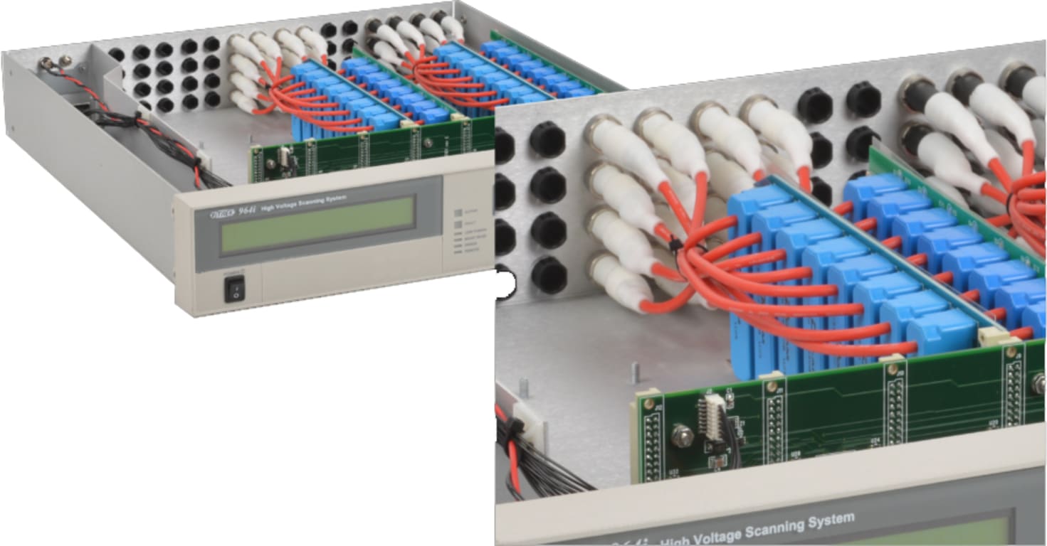 The 964i holds up to 8, eight channel HV switching cards. That’s up to 64 test points in a single mainframe – multiple units can be combined to increase capacity