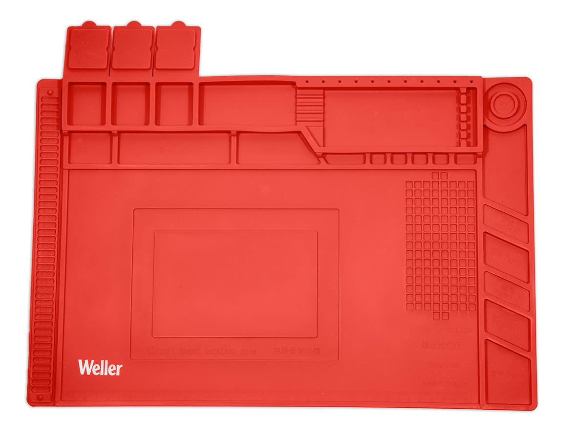Protect your surface with Weller's Medium Soldering Work Station Mat. The anti-slip, silicone mat resists high temperatures and helps to keep your space clean and tidy. Includes a ruler and individual compartments and four magnetic areas for storage.