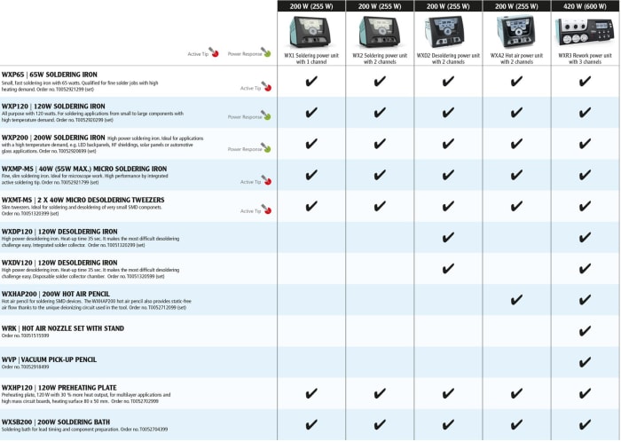 The Weller WXD2020N is compatible with several different types of soldering irons, desoldering irons, tweezers, fume extractors and much more. Please click the links below for more information: