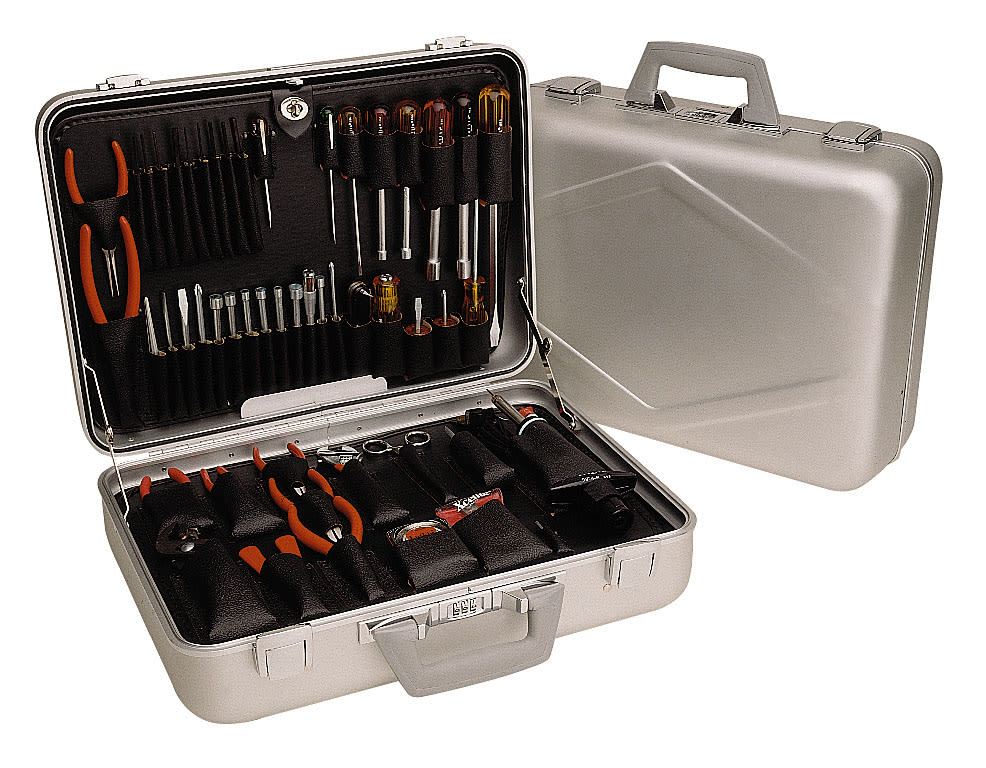 The Xcelite TCA150ST Tool Kit consists of carefully selected, 23 individual hand tools like 24 Series 99® interchangeable screwdriver/nutdriver blades and handles, XL70 offset ratchet screwdriver set, measuring tape, and solder. This kit also comes with a high-tech aluminum tool case with smooth a finish.