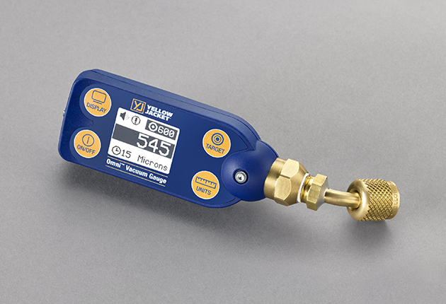 The YELLOW JACKET Omni Digital Vacuum Gauge is an easy-to-use, compact vacuum gauge that is loaded with features for the price. And it's rugged, too. Made with high impact, glass reinforced housing, it survives moisture and accidental drops or attachment to a high pressure line. The easy-to-clean vacuum sensor handles 450 psi positive pressure and reads several units of vacuum (microns, millibar, Torr, and Pascal).