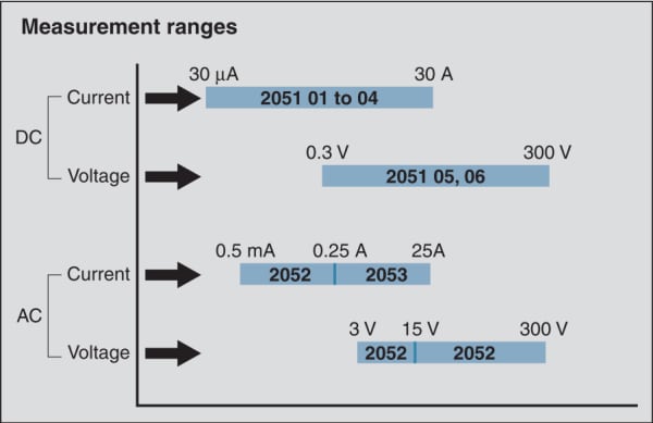 The E series of miniature portable Ammeters & Voltmeters consist of JIS C 1102-2 Class 1.0 and Class 1.5 instruments. The taut-band suspension system is used in the moving parts of models 2051 and 2052 to eliminate friction and provide strong resistance to shock impact. These instruments are functional and compact, making them suitable for labs at research centers and schools. They are also very useful for factory setups in which numerous instruments are arranged on a small tabletop area, and they are small enough to be carried for maintenance service use.