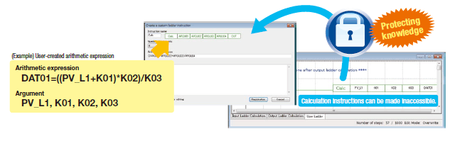 - Multi-line ladder programs such as numerical calculation can be simplified into a single line using a custom ladder program