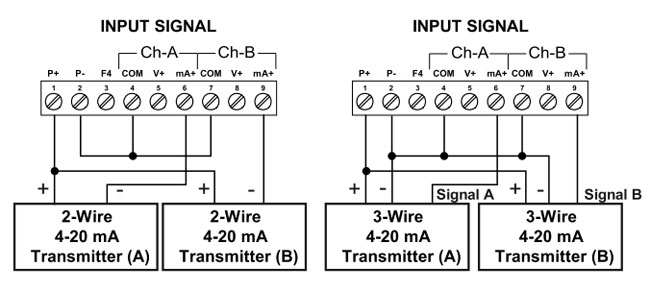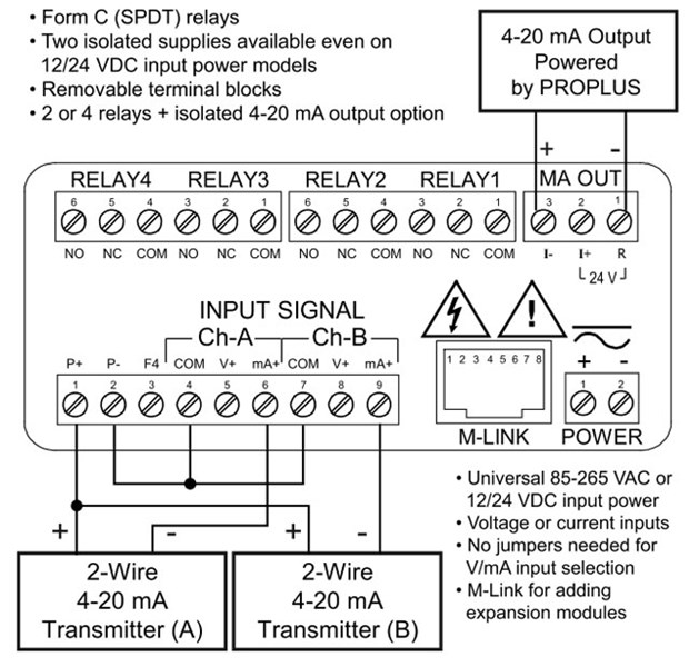 Terminals P+ & P-: 24 VDC ± 10%. 12/24 VDC powered models selectable for 24, 10, or 5 VDC supply (internal jumper J4). 85-265 VAC models rated @ 200 mA max, 12/24 VDC powered models rated @ 100 mA max, @ 50 mA max for 5 or 10 VDC supply. |