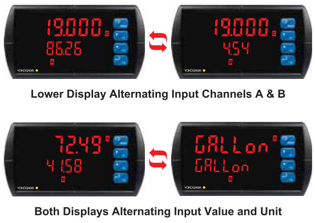 The Upper and Lower displays may be assigned to process values for Channels A (Ch-A), B (Ch-B), or C (Ch-C), toggle between (Ch-A & Ch-B, Ch-A & Ch-C, Ch-B & Ch-C, and Ch-A, Ch-B, & Ch-C), toggle between Channel & units, show channel gross value (no tare) or toggle net (tare) and gross values, show relay set points, max & min values, or Modbus input. The second display may also be set to show engineering units or be off, with no display. |