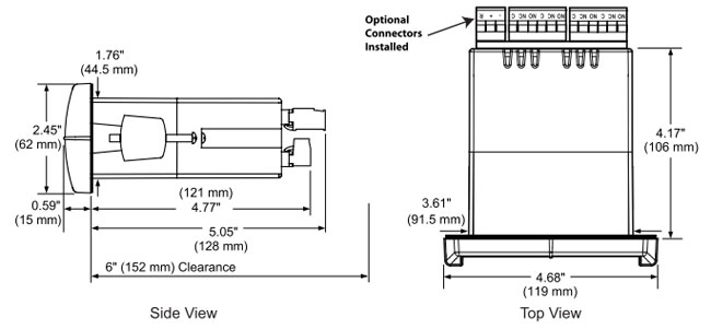 1/8 DIN panel cutout required: 3.622" x 1.772" (92 mm x 45 mm). Two panel mounting bracket assemblies are provided. |