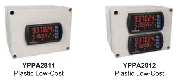 Lower display: 0.46" (12 mm) high. Both are 6 digits (-99999 to 999999), red LEDs |