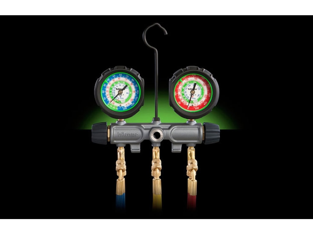 All the rough-and-tumble features of the 4-Valve Aluminum Manifold in a simple 2-valve combination. Because we know manifolds are your lifeline. The hilmor 2-Valve Aluminum Manifold is built to last with a forged aluminum body. It's designed to be leakproof with replaceable stainless-steel valve seats, SAE-style O-rings and a securely seated large sight glass. Front-mounted hose positions and a permanent location for temperature clamps result in added convenience. And it's finished off with comfort-grip rubberized handles optimally sized for easy turns.